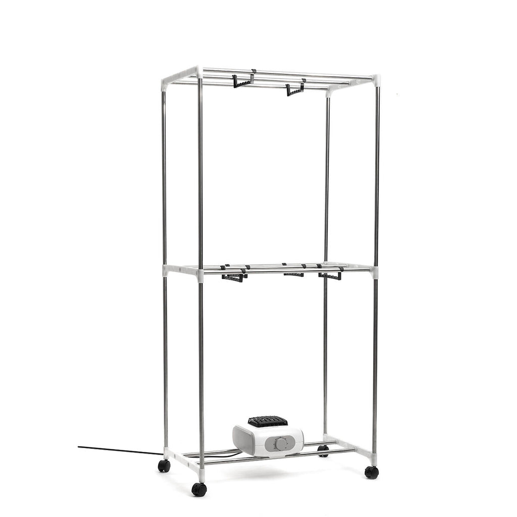Prenosni električni sušilnik perila z 2 višinama (1200 W), idealen za učinkovito in hitro obešanje in sušenje oblačil. Poleg tega sterilizira in odstranjuje vonjave. Ima 6 nosilcev za obešalnike, časovnik, kolesa ter odstranljivo in pralno prevleko z zadrgo.