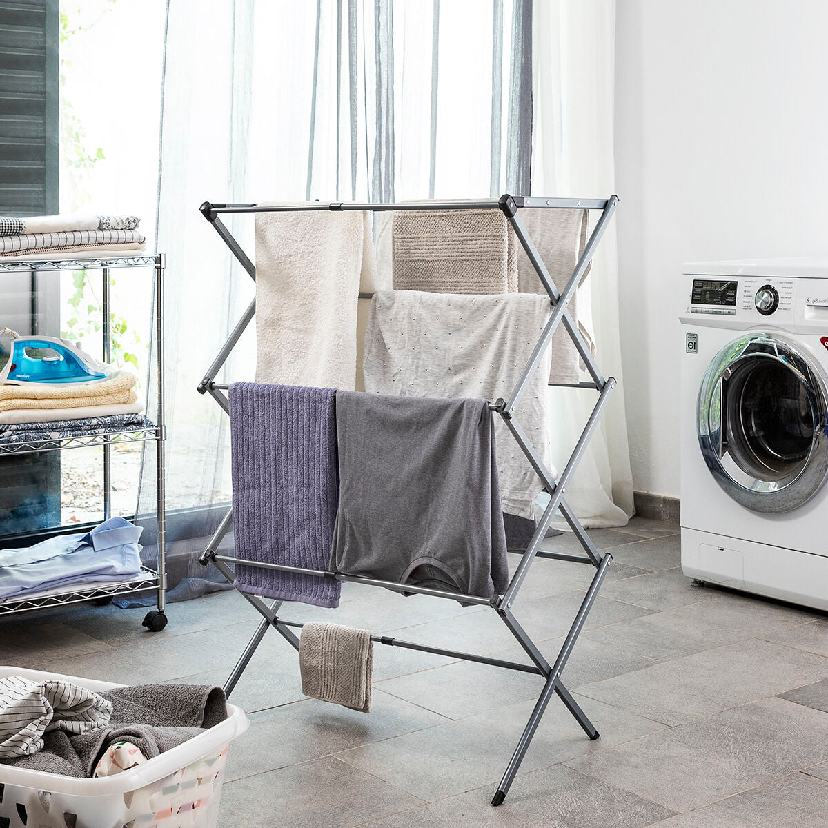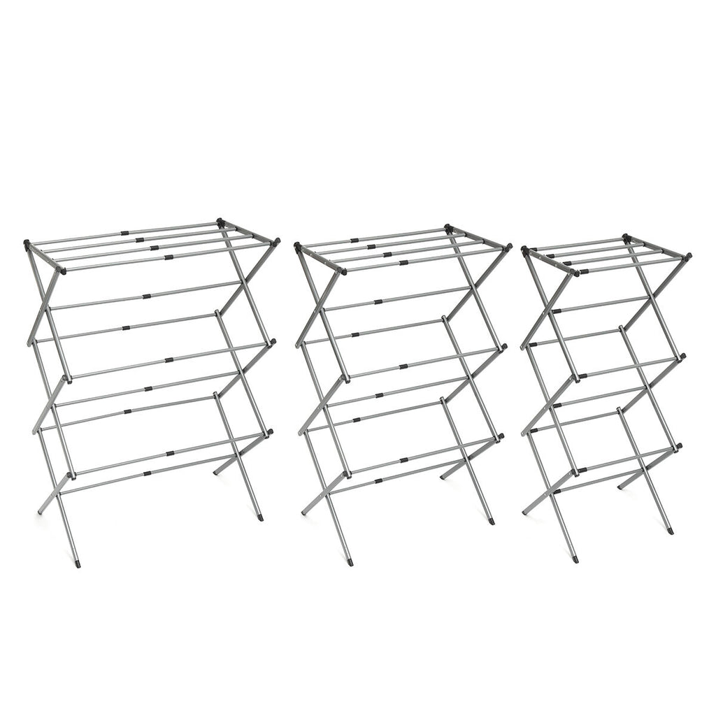 Zložljivo in raztegljivo stojalo za sušenje oblačil s 3 nivoji višine je zelo priročno, saj optimizira prostor med uporabo in shranjevanjem. Njegova zasnova omogoča prilagoditev količini oblačil, ki jih želimo obesiti v določenem trenutku, in zagotavlja popolno udobje, saj ne zavzame veliko prostora. To izvirno kovinsko stojalo ima 11 palic za sušenje, je izredno kompaktno, lahko in odporno na vodo. Vključuje ilustriran priročnik o uporabi in ga je enostavno sestaviti brez uporabe orodja.