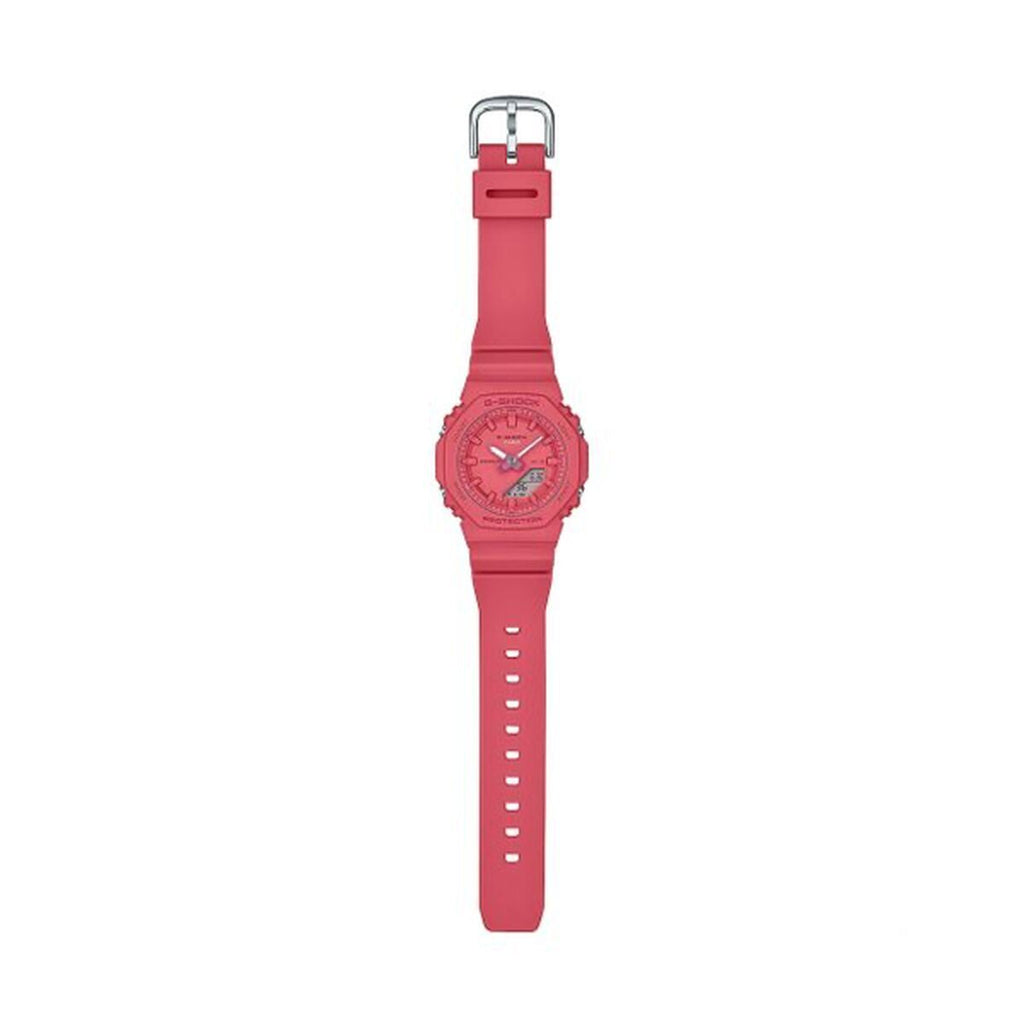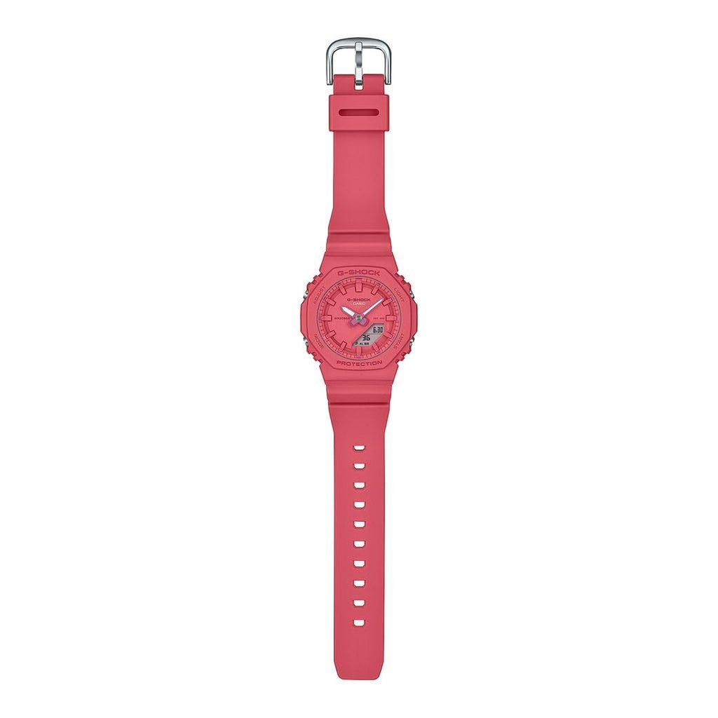 OAK COMPACT znamke Casio G-Shock je ženska ura, ki združuje funkcionalnost in slog v sodobni, ženstveni zasnovi. Njena značilnost je roza barva na ohišju in smolnem paščku, ki zagotavlja lahkotnost, vzdržljivost in udobje pri vsakodnevni uporabi. Ta večfunkcijski model vključuje različne praktične funkcije, primerne tako za vsakodnevne aktivnosti kot neformalne priložnosti, kjer je potreben učinkovit nadzor časa. Vrsta zapiranja z zaponko zagotavlja varno in trdno prileganje na zapestju, prilagodljivo različnim velikostim brez izgube stabilnosti ali udobja. Skupaj OAK COMPACT ponuja tehnično in estetsko rešitev, ki ustreza potrebam sodobne ženske, hkrati pa ohranja znano vzdržljivost in zanesljivost linije G-Shock, z bolj nežno in privlačno roza barvo. Ta ura predstavlja uravnoteženo izbiro za tiste, ki cenijo večfunkcijski dodatek z žensko usmerjenim dizajnom in funkcijami za raznoliko vsakodnevno uporabo.